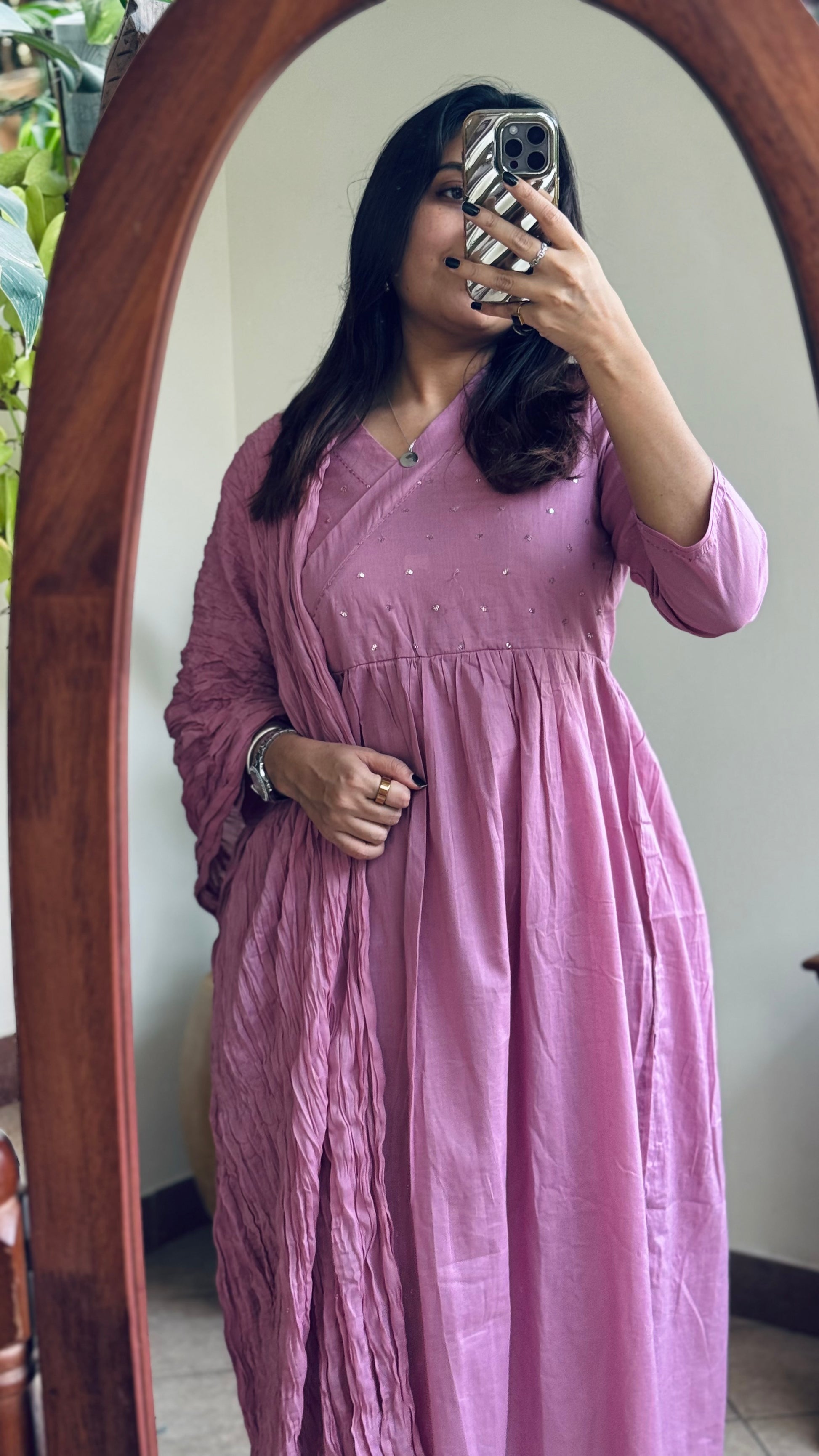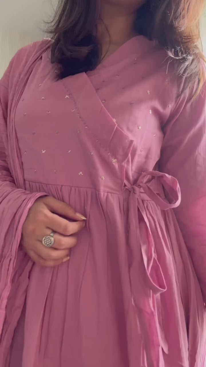 Soft cotton wrap gathered dress with a side tie up , minimal sequins glitters scattered on the yoke - a simple and subtle mul cotton suit set with crushed cotton dupatta.