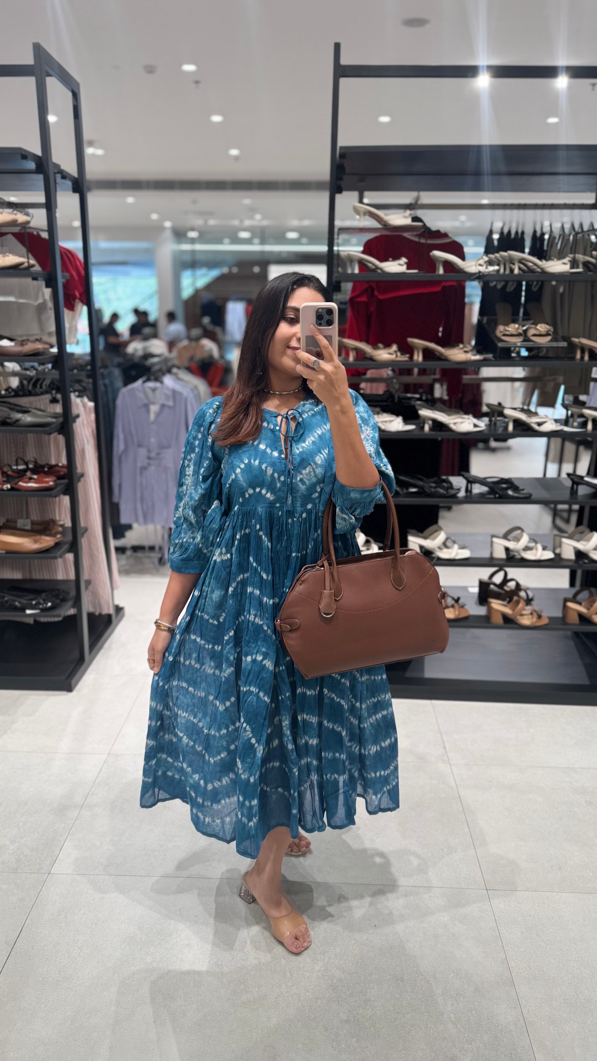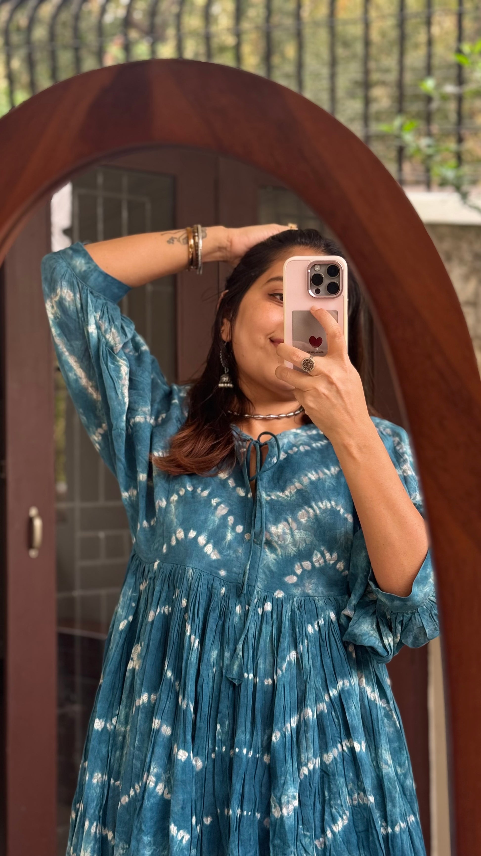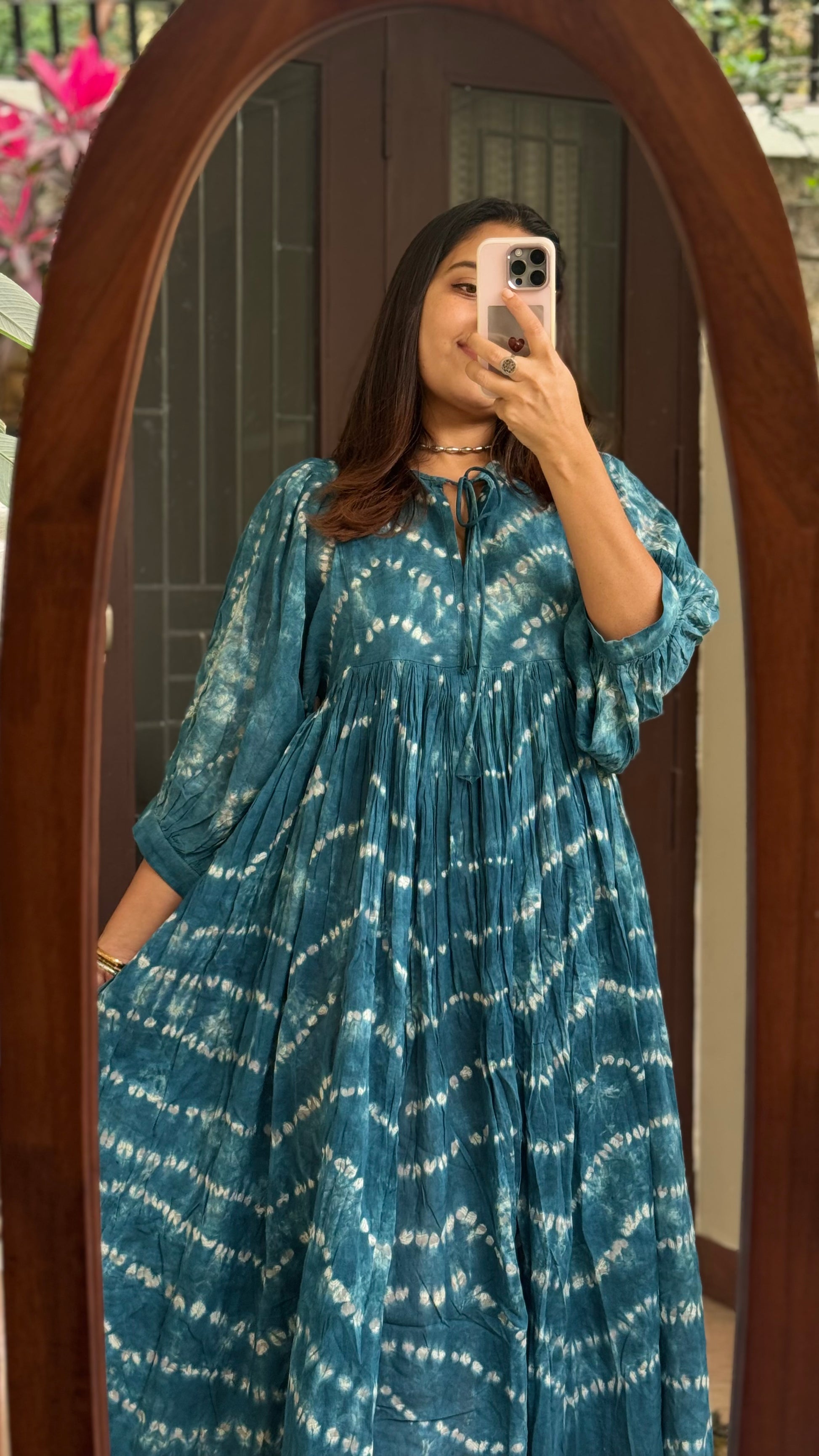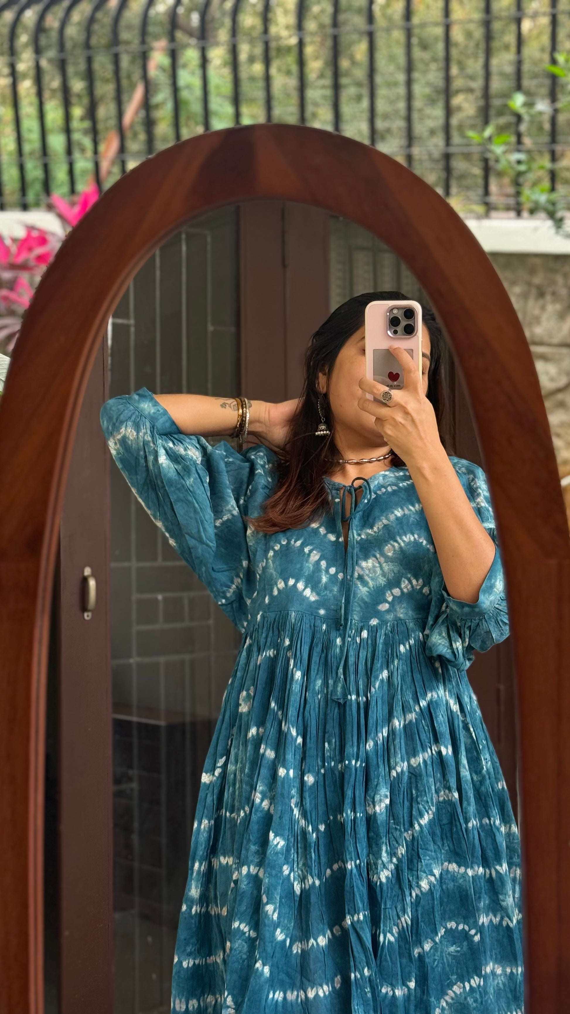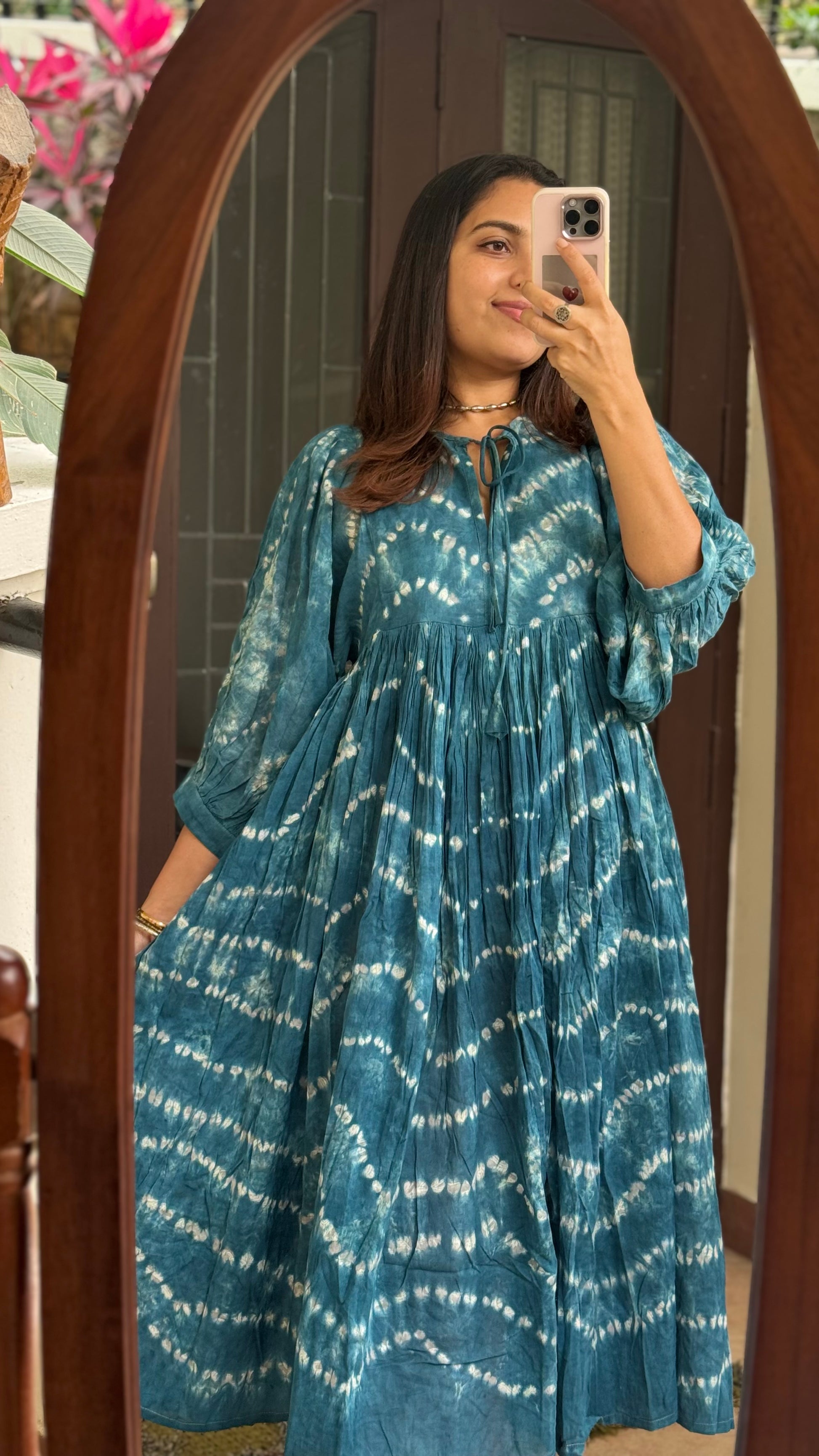 Soft and breathable mul cotton dress with tie and dye all over in teal shade . The neckline tie ups and balloon sleeves makes it a relaxed fit and easy to carry all day long ✨