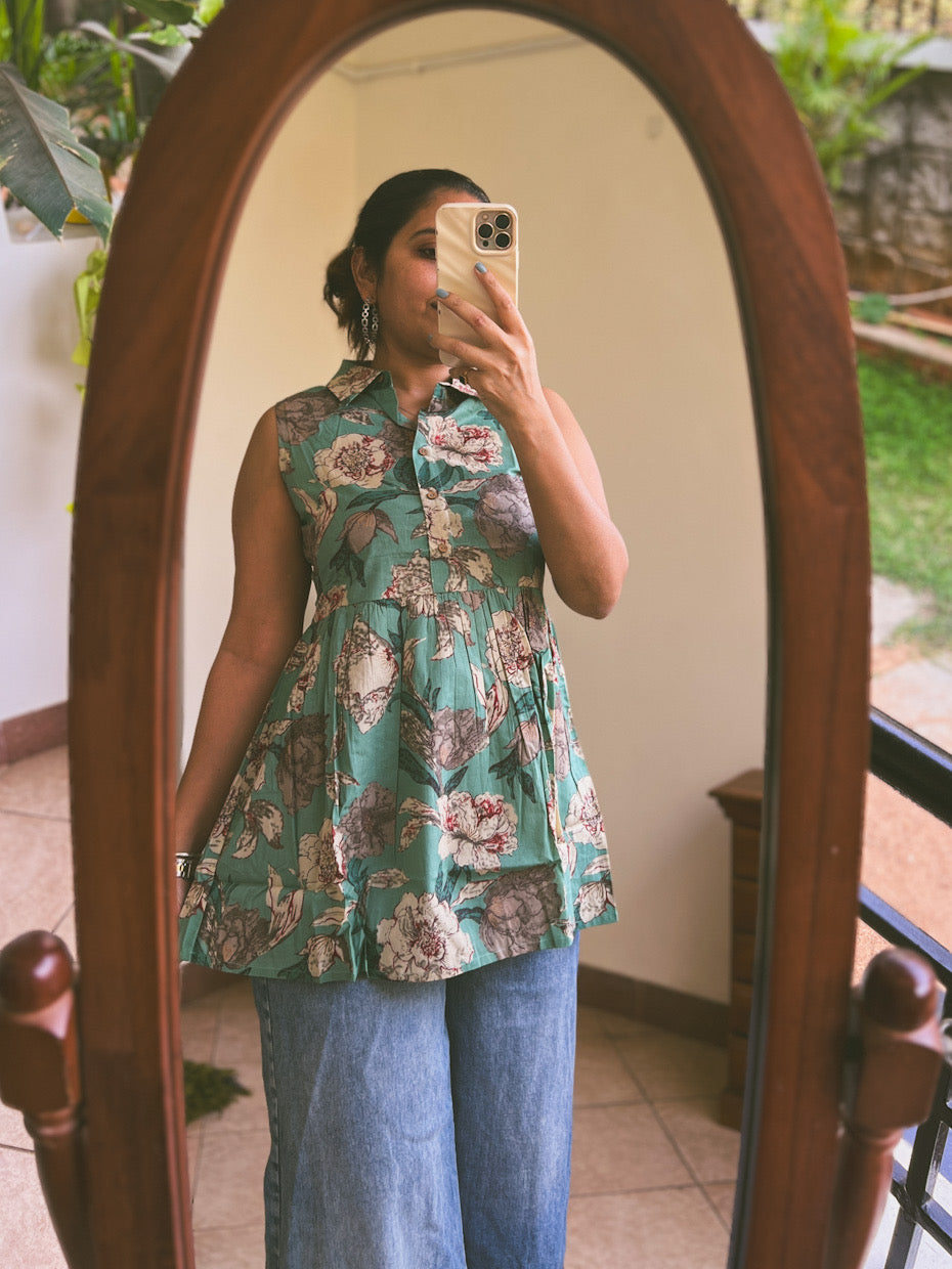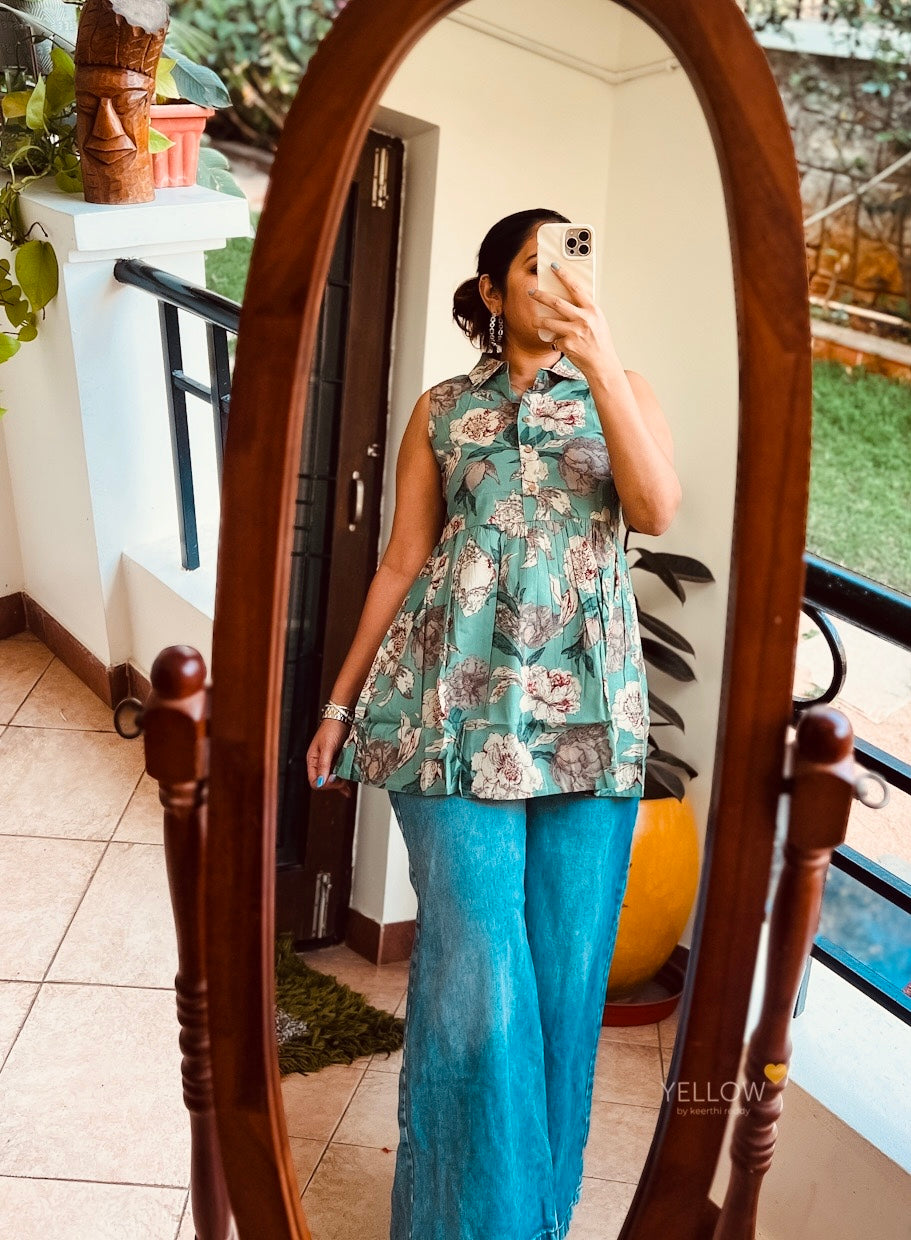 Our happy go floral tunic - the perfect pairing for palazzos or denims .With utmost comfort , this floral tunic is effortlessly playful and relaxed fit .