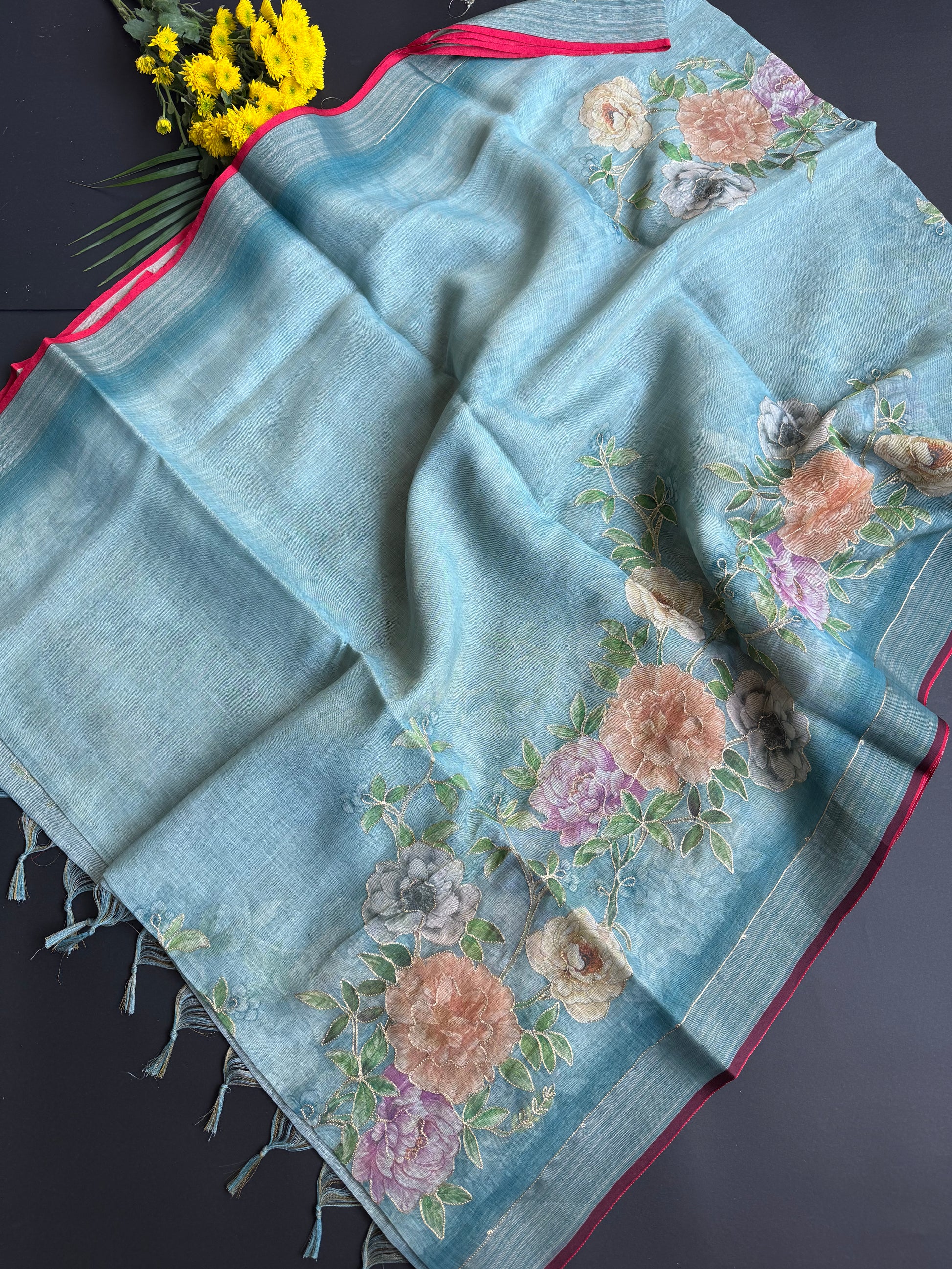 LINEN SAREE WITH FLORALS