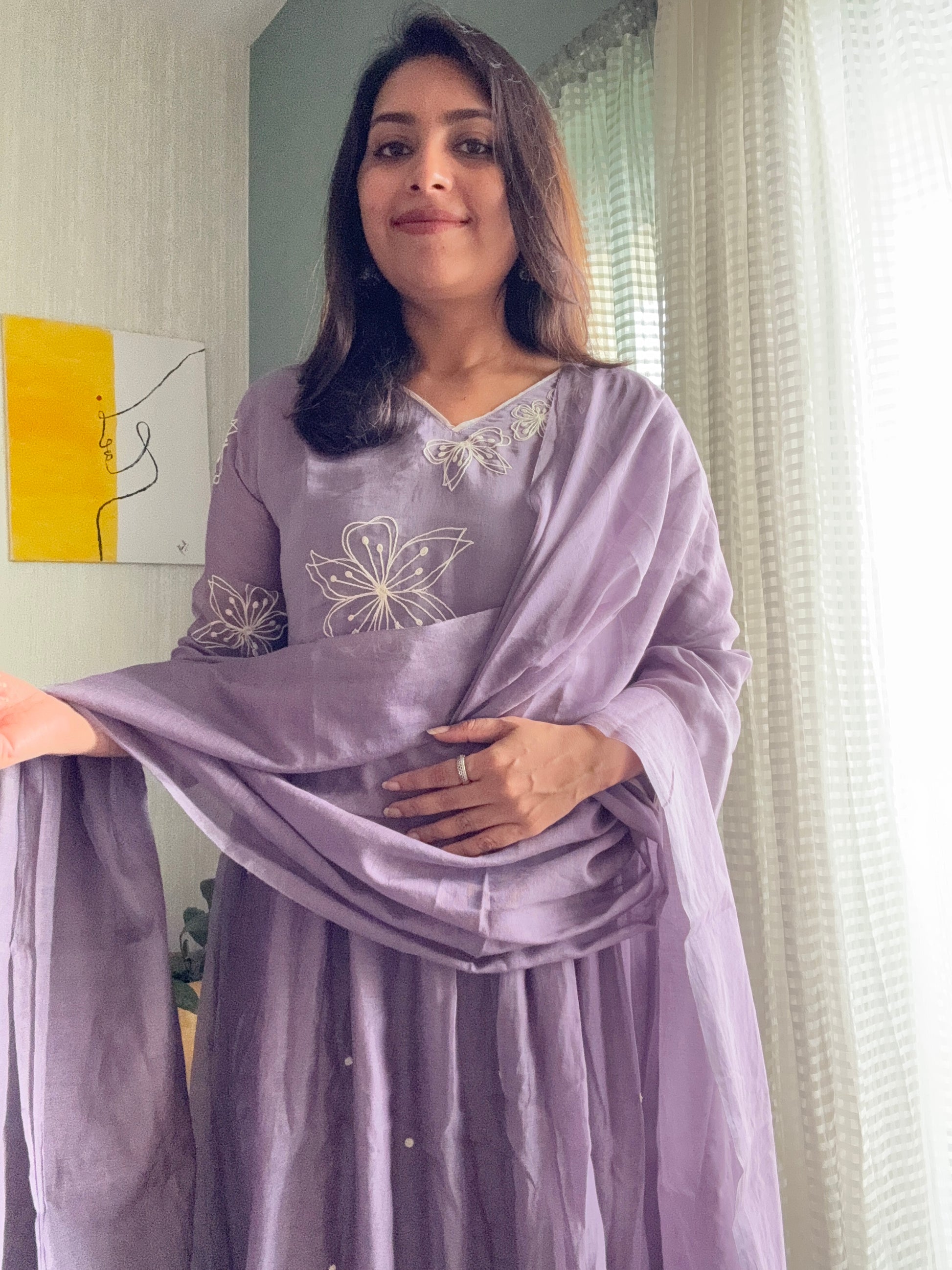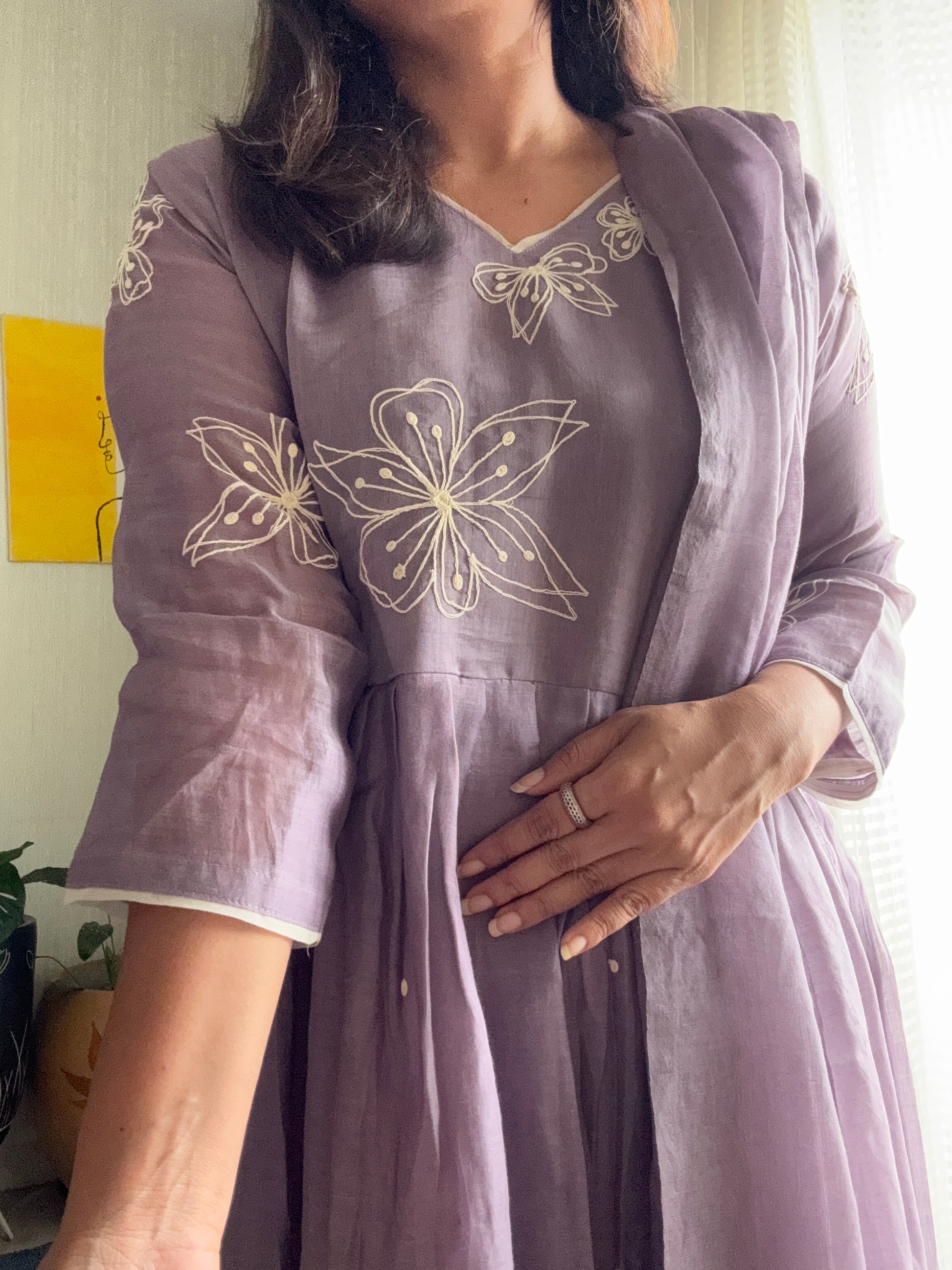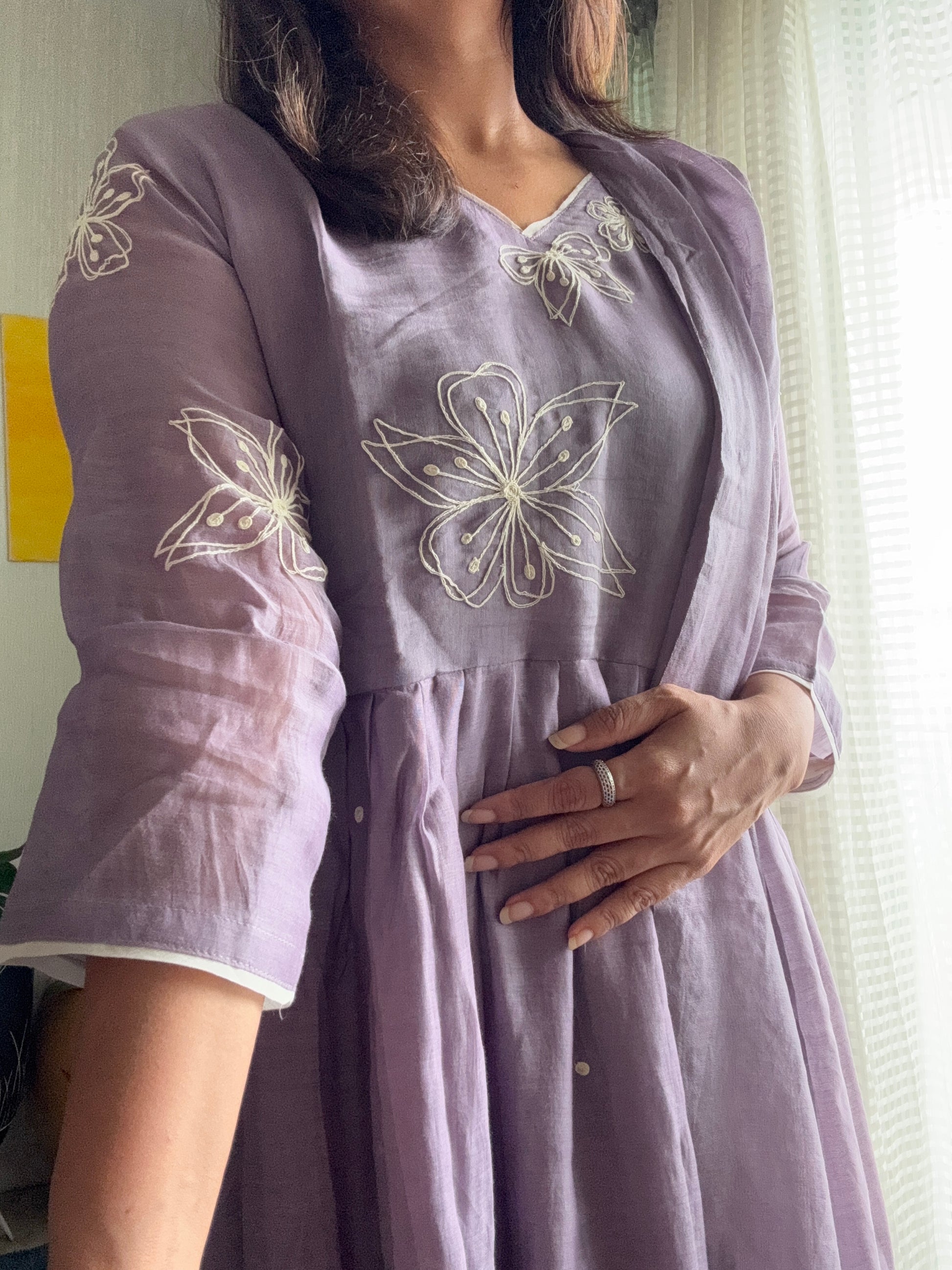 Soft Chanderi suit set with delicate thread worked florals ok yoke , tiny thread motifs allover the gathered flare. Tinge of white outlines the dress giving it a subtle and classy look.