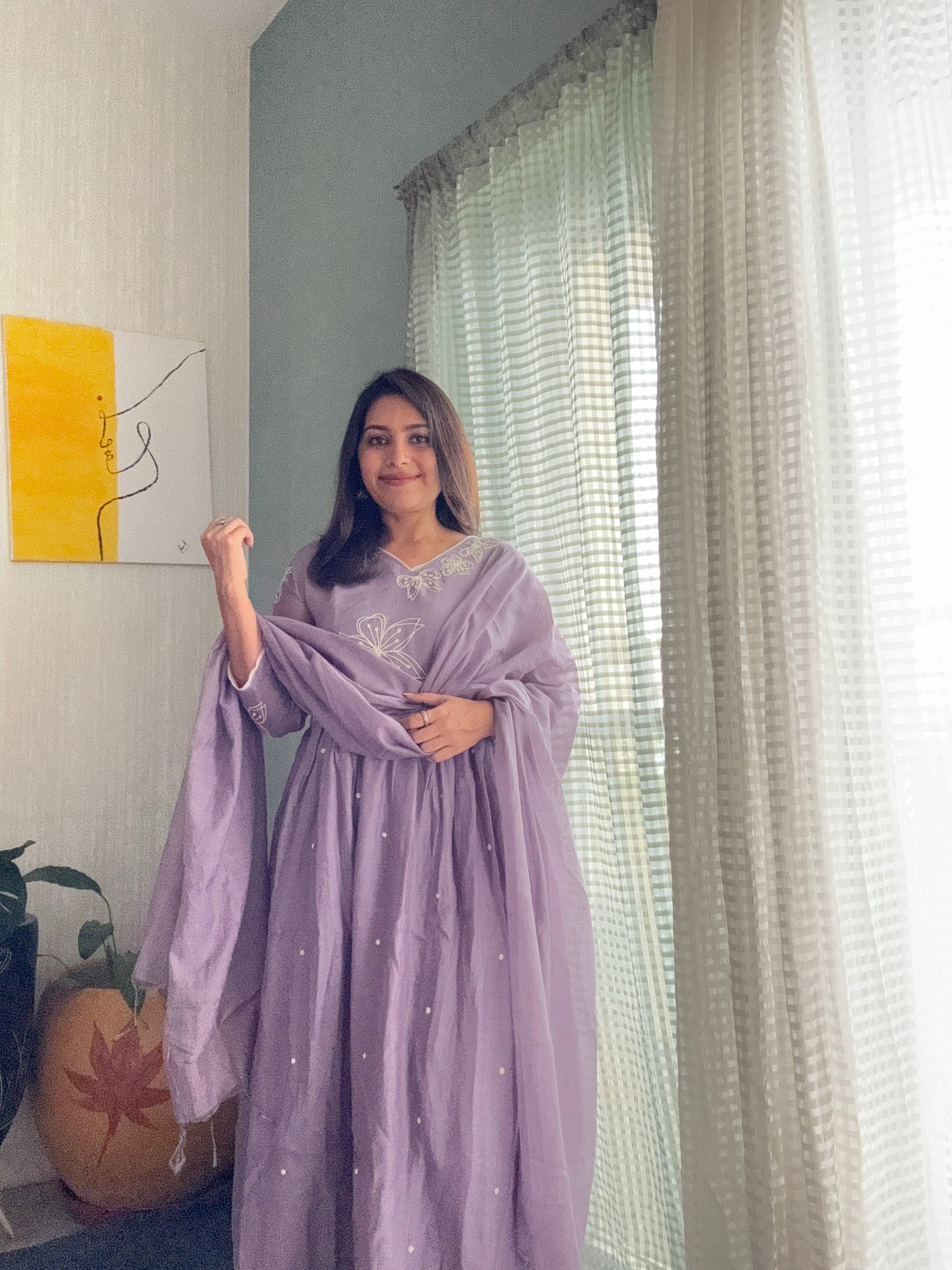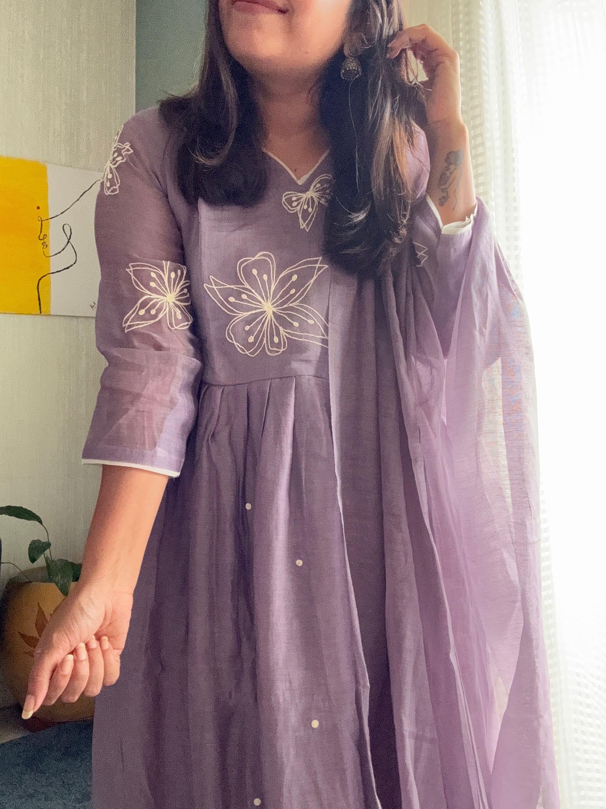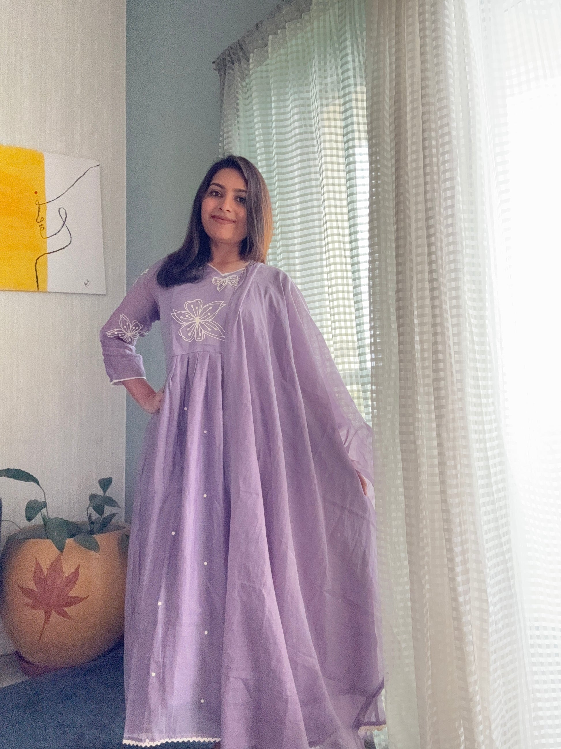 Soft Chanderi suit set with delicate thread worked florals ok yoke , tiny thread motifs allover the gathered flare. Tinge of white outlines the dress giving it a subtle and classy look.